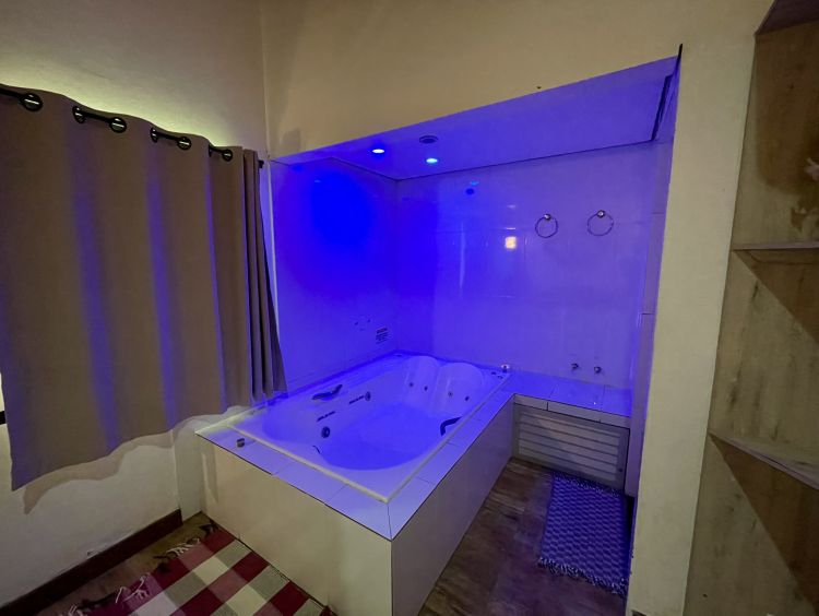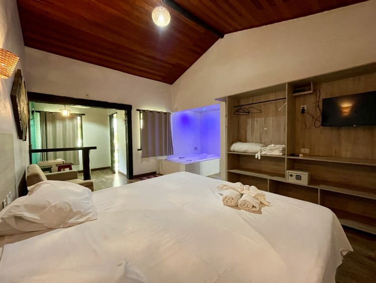 super espaçoso, mini sala de estar com poltrona dois lugares, travesseiro nasa, cama King size, toalhas fio egípcio, roupão, balcão para lanches, frigobar, ventilador de teto, ar condicionado, TV a cabo, hidromassagem dupla com aquecimento a gás, varanda privativa com rede, vista para jardim e mata nativa e Cofre LEP. Não comporta cama extra, Não acomoda crianças.